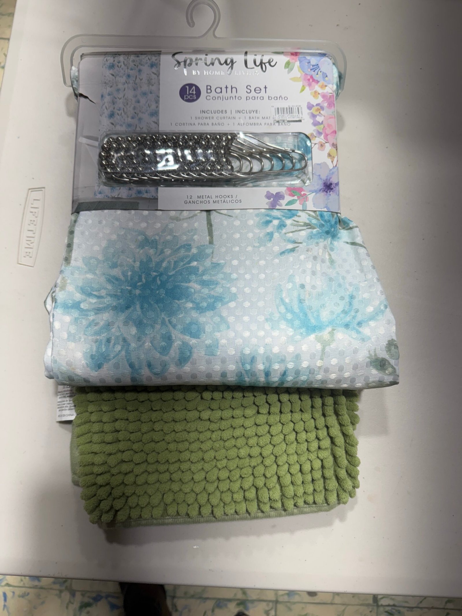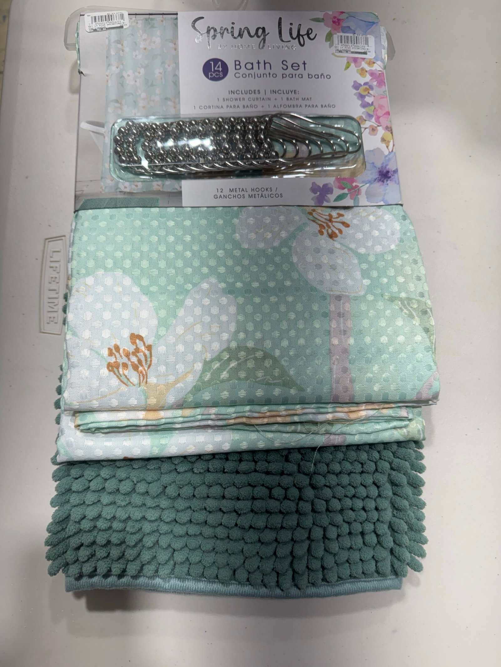 Ce paquet comporte un rideau de douche le tapis et les crochet de rideau
